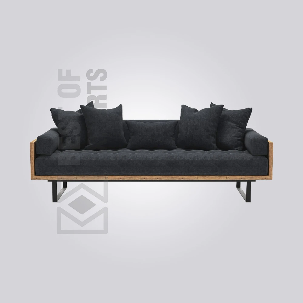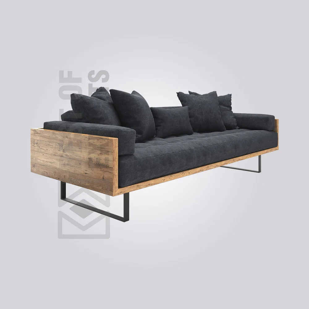 This Aldon Industrial Sofa blends natural textures and industrial design. A robust, exposed wooden frame showcases the wood’s character, while deep charcoal cushions provide comfort and contrast. Supported by an angular black metal base, this sofa is a distinctive, inviting seating option for any contemporary space.