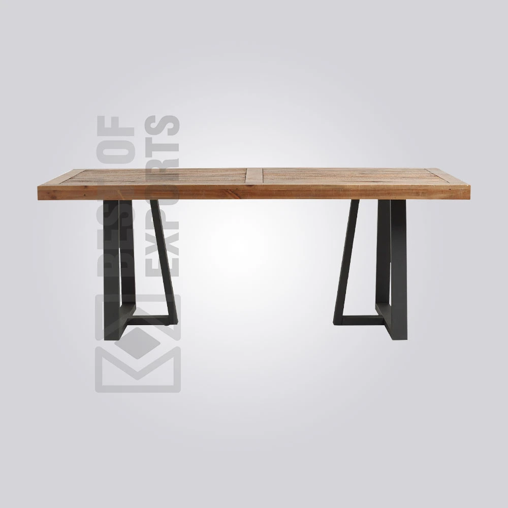 The Alpine Reclaimed Wooden Table combines rustic wood and industrial design. The sturdy wooden plank top, with its warm finish, highlights the natural grain. Supporting it are two uniquely shaped, dark metal bases with an angular design. This striking combination creates a durable and visually appealing centerpiece for any restaurant space.