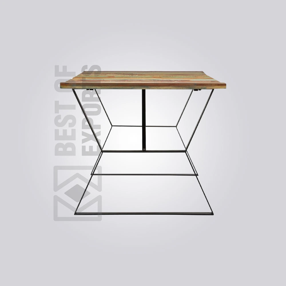 - The tabletop is crafted from reclaimed wooden planks, each with a unique finish and texture, ensuring no two tables are exactly alike.